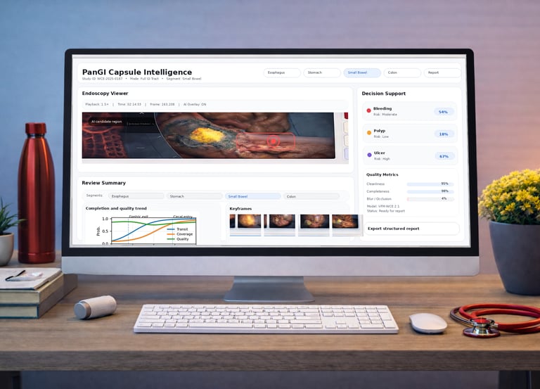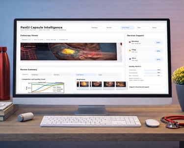 PanGI Landmark Graph™ transforms a capsule video into a patient-specific, whole-tract GI map that is easy to review and difficult to overlook. Using modern vision-language and video foundation models, it recognizes key anatomical landmarks, separates the study into clear GI segments, and links every moment of the exam to its most likely location. Clinicians can navigate the exam by segment, jump to the most relevant moments, and confirm findings with organized evidence, rather than having to scan endless footage. The system also tracks image quality and completion signals throughout the study, helping teams trust what they see and quickly identify when additional review is needed. The result is a refined, faster workflow that delivers clearer clinical insight from a single capsule exam.