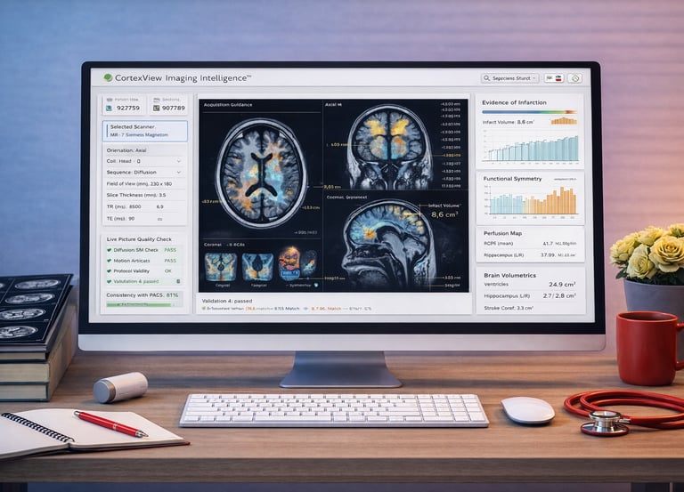 CortexView Imaging Intelligence™ enhances brain and multi-modal imaging from scan setup to final report by guiding protocol selection, enhancing image clarity, and ensuring consistent measurements. It helps technologists capture reliable scans with fewer repeats through real-time quality checks during acquisition, then supports radiologists with clear overlays and structured measurements that are easy to verify. The platform seamlessly integrates into radiology workflows, enabling teams to transition from acquisition to diagnosis more efficiently, with consistent performance across scanners and sites.